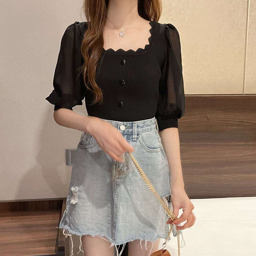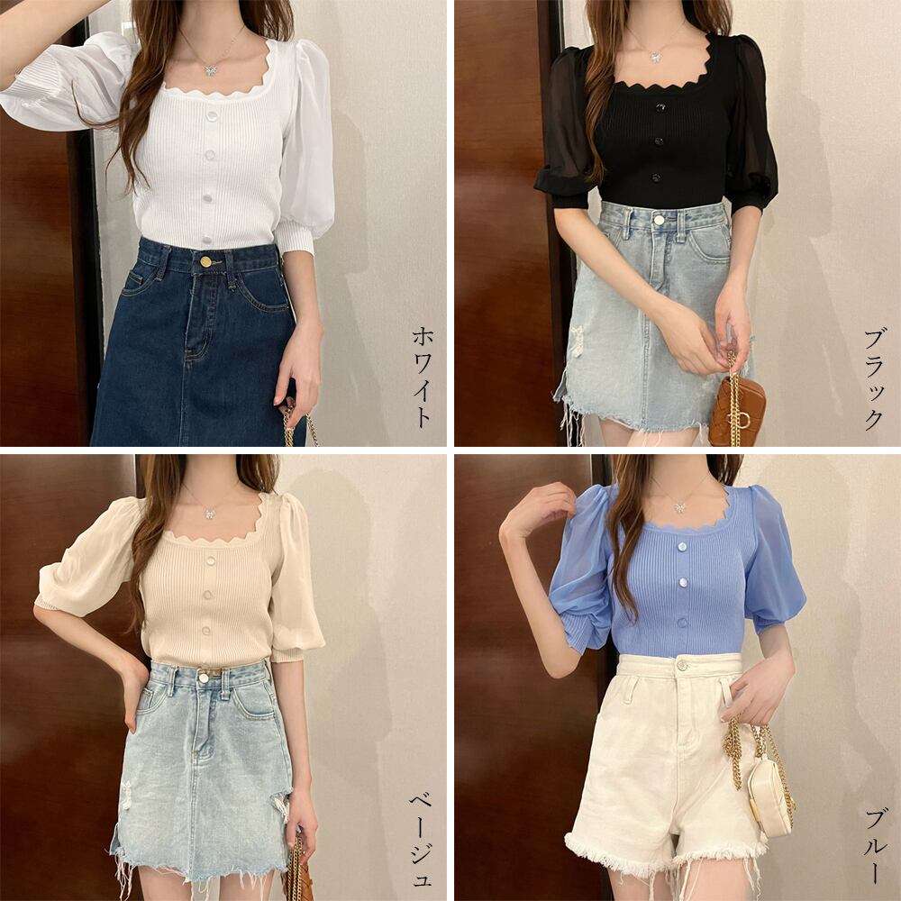 サマーニット レディース パフスリーブ ニットソー 半袖 プルオーバー 無地トップス シフォン袖ブラウス カジュアル