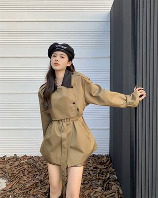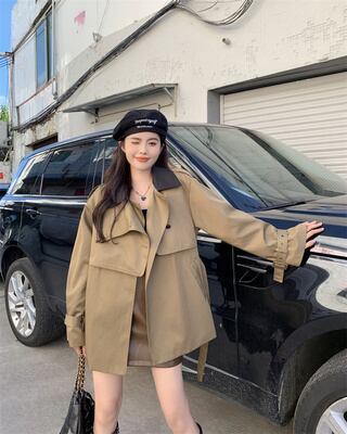 英国スタイル/カーキ/ウインドブレーカージャケット/女/初秋/新しいデザイン/小さい体/ケープ付き/ルース/中長スタイル/外套