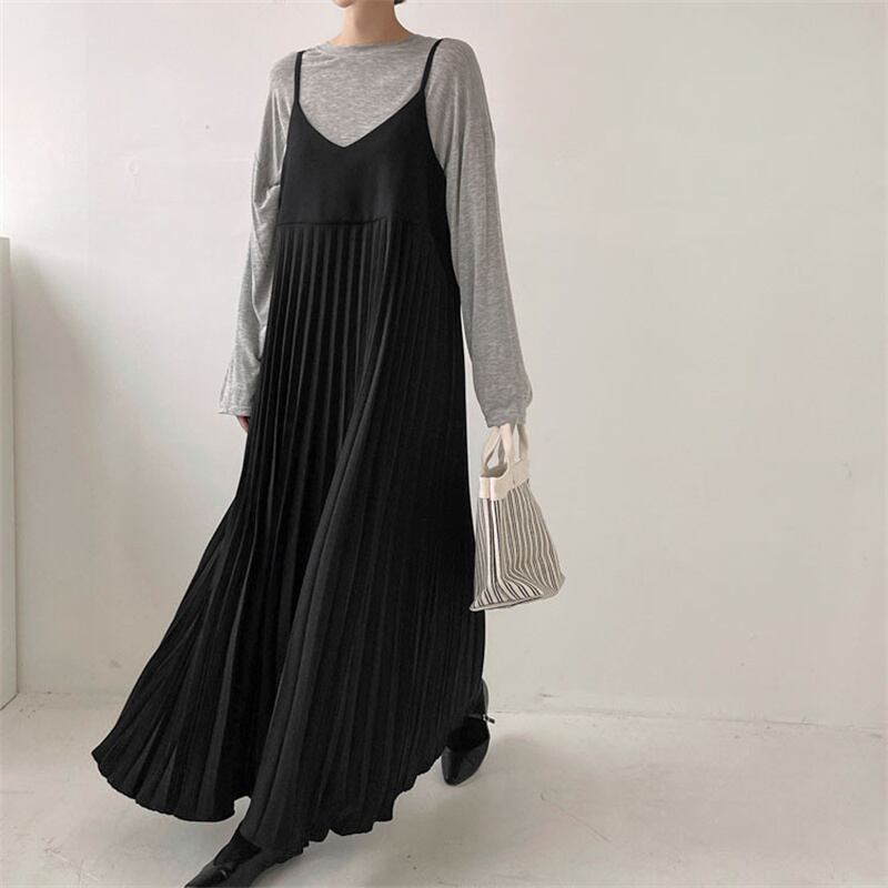 秋新作 カジュアル ゆったり ノースリーブ プリーツ ロング 膝下丈 キャミソールワンピース