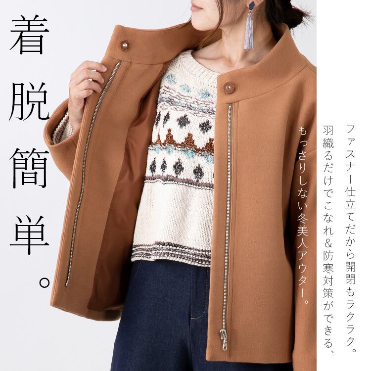 フェイクウール素材のショート丈でウールコートよりも軽やか。ストレスなく羽織れて疲れにくく、デイリーに、お仕事の通勤に、身軽な着丈で車や自転車に乗る際もオススメです。