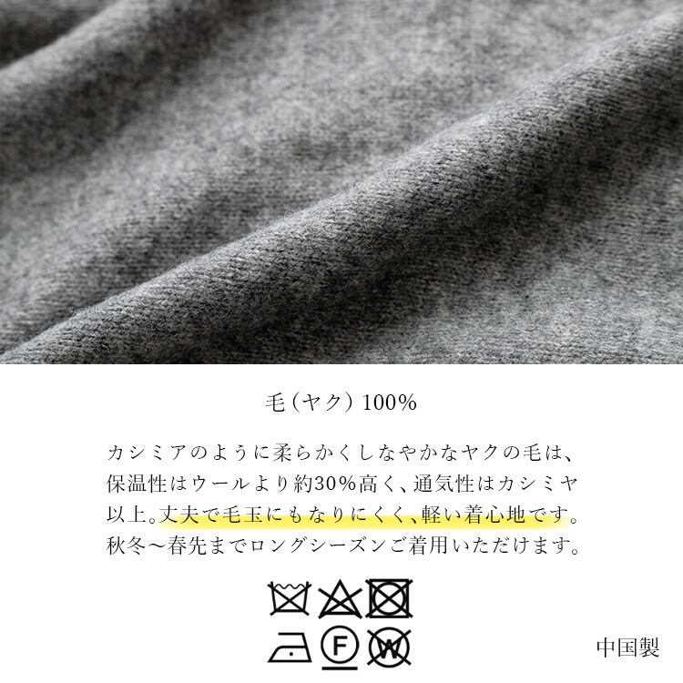 カシミアのように柔らかく滑らかな肌触りが魅力のヤクの毛は非常に良質で希少な高級素材。保湿性はウールより約30%高く、通気性はカシミヤ以上とも言われています。他の獣毛素材に比べ、丈夫で毛玉にもなりにくいのも嬉しいポイント。秋冬~春先まで着て頂けます。